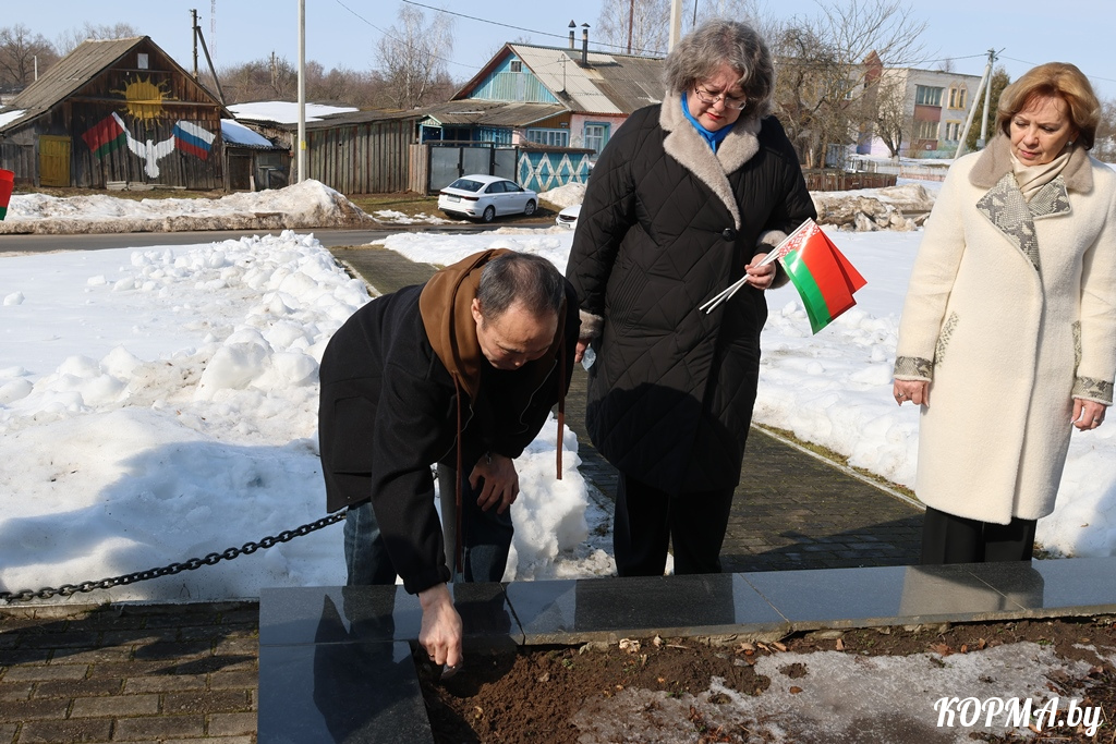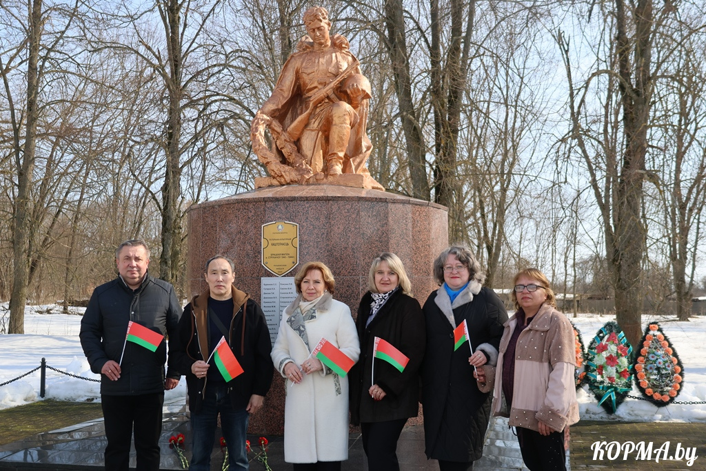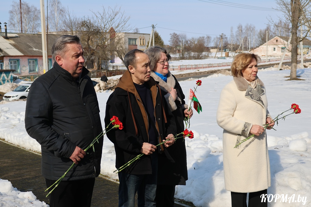 Прибыв на Кормянщину, гости района – Иннокентий Крычкин и председатель Минской областной организации Белорусского профсоюза работников леса и природопользования Сергей Игнатович – побывали на Аллее Славы, где возложили цветы к подножию памятника, установленного на братской могиле воинов-освободителей, а затем направились в деревню Струкачёв.