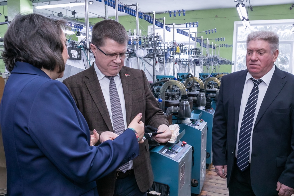 Программа визита началась в Новкинском сельсовете Витебского района с посещения фабрики «Василина», которая специализируется на производстве чулочно-носочных изделий. Глава национального профцентра вместе с председателем Витебского райисполкома Сергеем Егоровым и директором фабрики Петром Феоктистовым осмотрел производственные цеха, ознакомился с условиями труда работников, уделил особое внимание соблюдению техники безопасности.