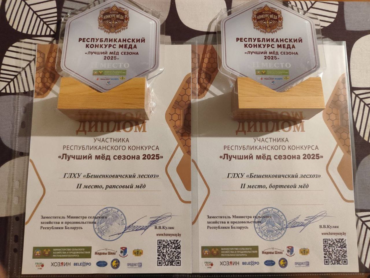 Мед Пятигорского лесничества Бешенковичского лесхоза, который Евгений Букат представил на выставке Республиканского конкурса меда, получила высокую оценку. Бешенковичский лесхоз — в топ‑3 производителей лучшего рапсового меда в стране. В номинациях «Рапсовый мед» и «Бортевой мед» завоевал 2 место.