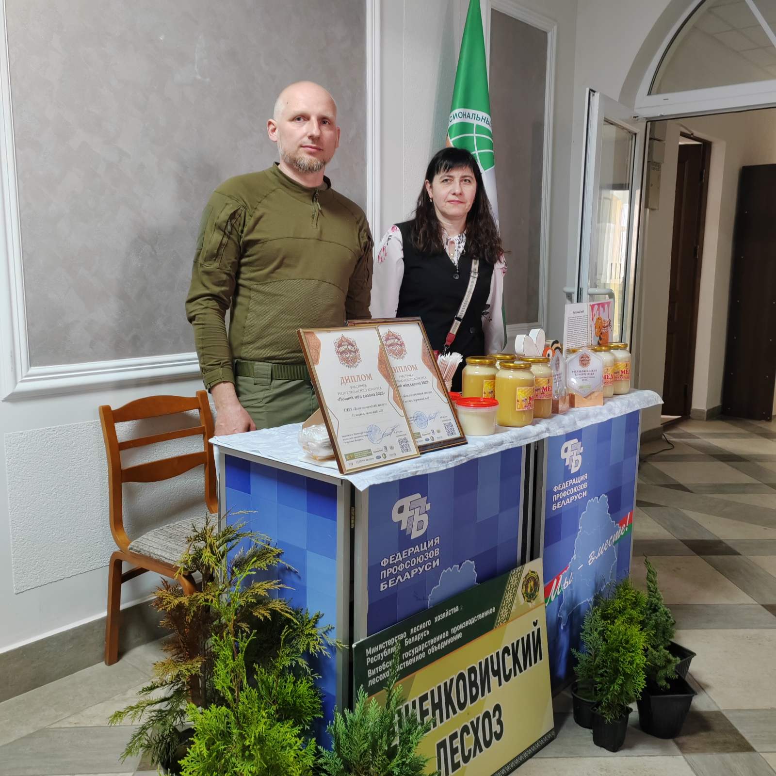 В рамках акции "Кожная пятнiца — роднае, сваё" Евгений вместе с председателем первичной организации Бешенковичского лесхоза Зайцевой Анной Михайловной, представили разновидности меда в Витебском областном объединении профсоюзов.